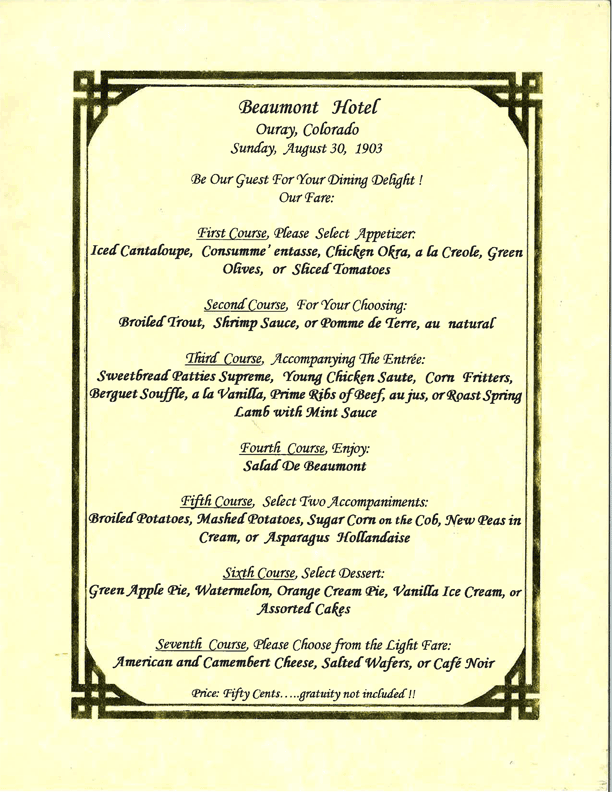 Quite a few years later, Mrs. Phillips had passed away and the Beaumont came up for auction. I bid, but was outbid by another, who spent at least two million on its restoration, and it turned out grand. While I was going through the old hotel, in the basement I found a pristine menu from Sunday, April 10, 1902. I had forgotten about it, and as I was going though some old books and papers, there it was. On April 10th 1902, a scrumptious five course meal was 50 cents. What would such a meal cost today in a swank hotel, as this one was, and after restoration, is once again. It is closed for the winter now, so I cannot check, but I’ll guarantee you that this meal couldn’t be touched, at say the “Brown Palace,” in Denver, for less than at least $60-$75.
