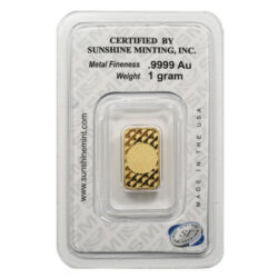 These bars are produced by renowned Sunshine Minting. The mint has been producing precious metal products since 1979. These bars are a great example of their production quality and design know-how. Each bar is minted with one gram of .9999 pure gold. Weight and purity are stamped on each bar. The bars feature the mint’s elegant stamp which showcases a bald eagle in flight before a blazing sun. The reverse side of the bars features a sunrise logo and pattern. These bars are an excellent way to invest in gold which is why they have been sought after by investors as well as collectors.