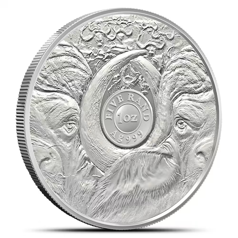 On the reverse of these South African Big Five Series II Buffalo 1 oz Silver Coins, you will see closeup views of two halves of a buffalo’s face. If you purchase multiple coins, you can line them side by side to form a complete picture of the face.